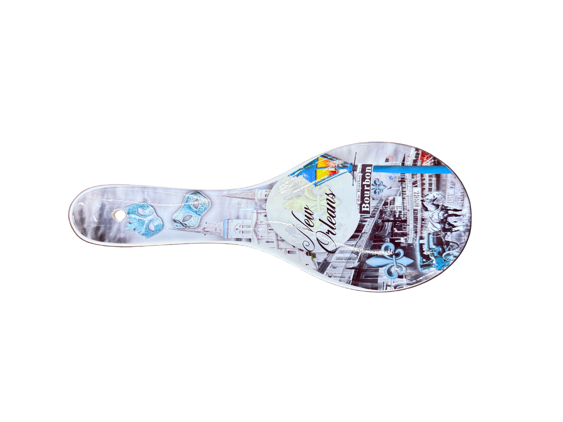Add a touch of New Orleans charm to your kitchen with this elegant French Quarter Spoon Rest. Featuring a classic black-and-white design accented with soft blues, it beautifully captures the city’s most beloved sights — wrought-iron balconies, horse-drawn carriages, the Natchez paddlewheeler, and the iconic Bourbon Street lamp post.