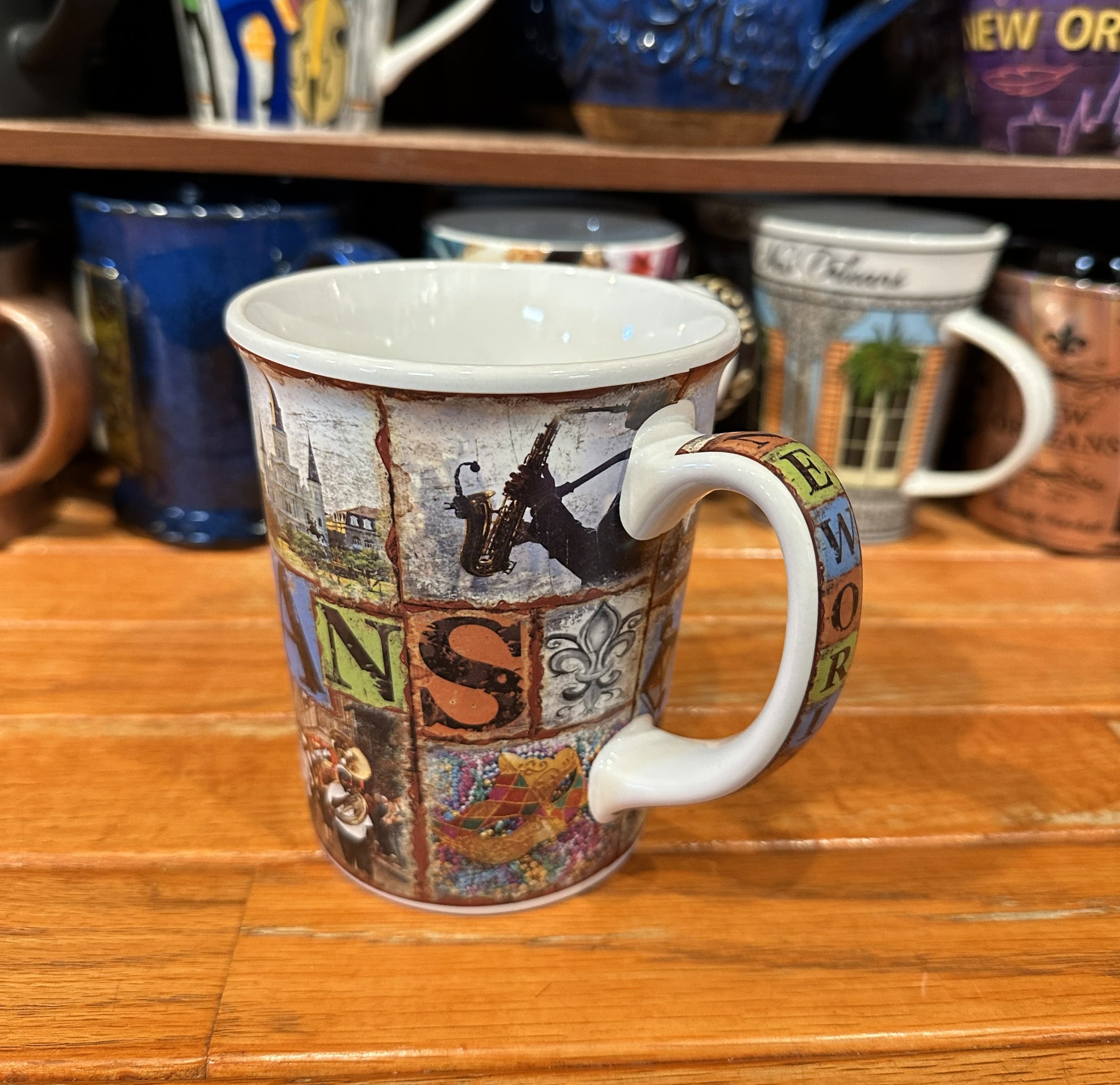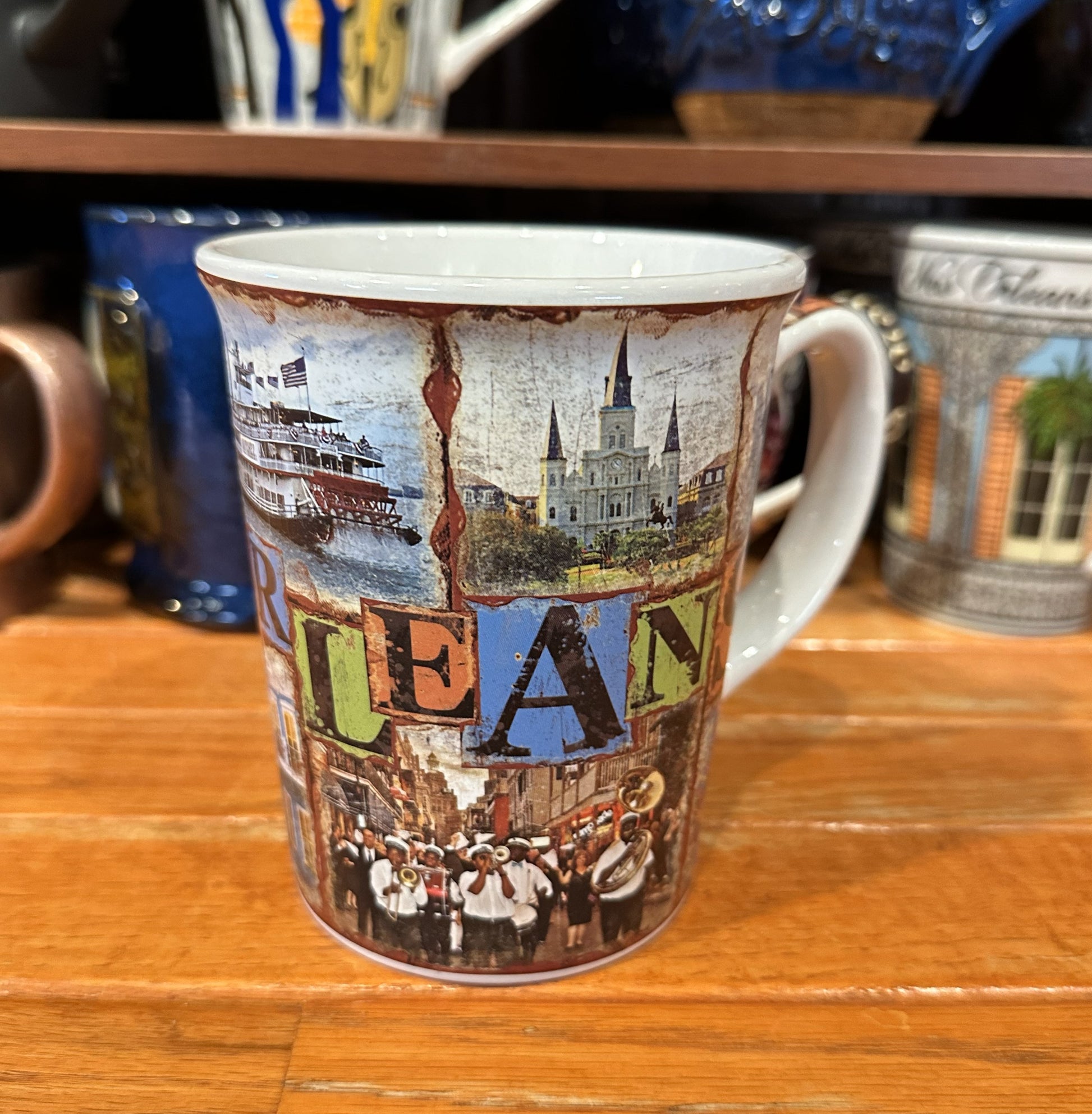 Wrapped in a colorful, collage-style design, this mug features iconic imagery from the city—Jackson Square, jazz musicians, Mardi Gras masks, the St. Louis Cathedral, and classic French Quarter balconies—each block styled like a weathered fresco. The bold, distressed lettering spells out “New Orleans” across the surface, with the handle continuing the theme in multicolor.