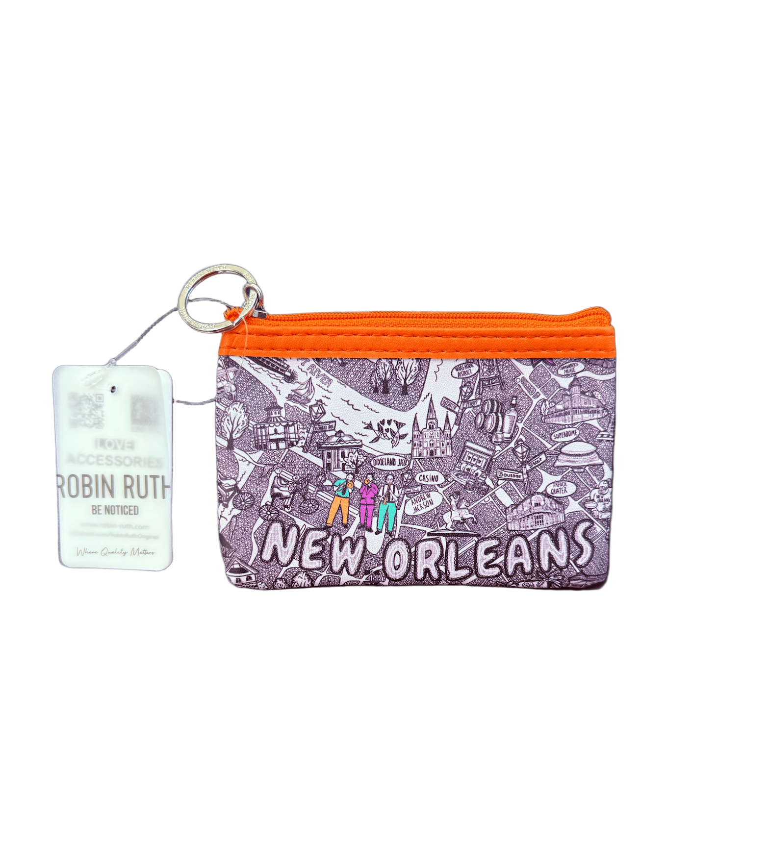 Keep a piece of the Crescent City close with our New Orleans Map Coin Purse by Robin Ruth. This stylish and compact vinyl pouch showcases a playful illustrated map of New Orleans landmarks—complete with jazz musicians, streetcars, and Bourbon Street charm. With its bold orange zipper and secure key ring, it’s both fashionable and functional for your everyday adventures.
