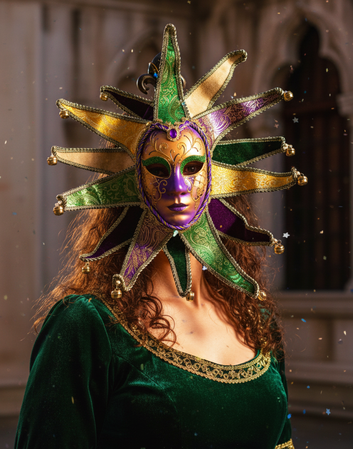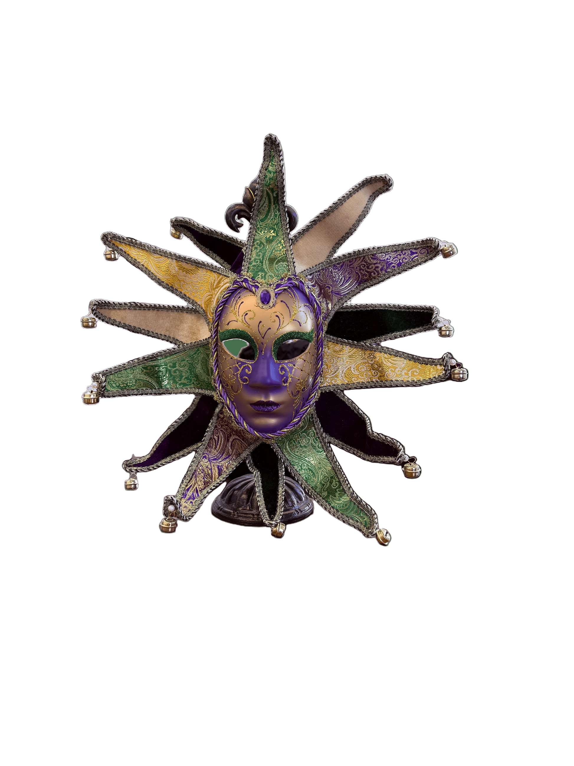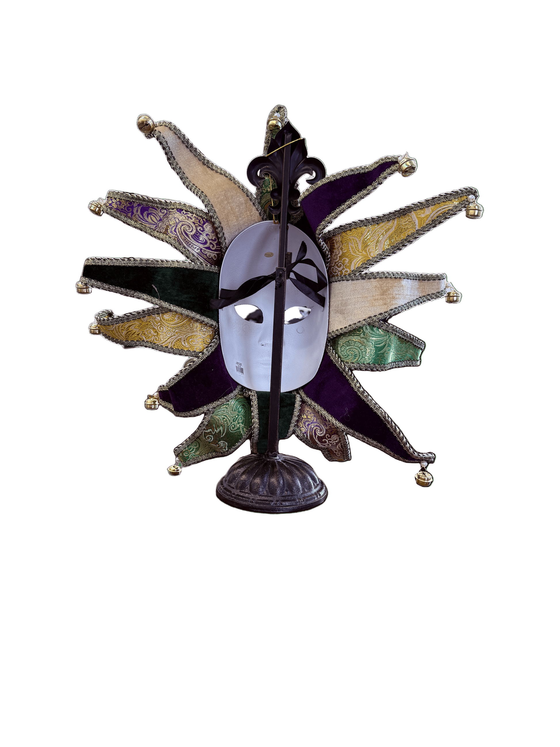 Celebrate Mardi Gras authenticity with this expertly crafted Jester Mask, featuring the iconic purple, green, and gold palette. Metallic points tipped with jingling bells add a dynamic flair, evoking traditional festivity. Designed for both style and comfort, this mask embodies the vibrant spirit of the season while ensuring lasting wear for parades and parties.