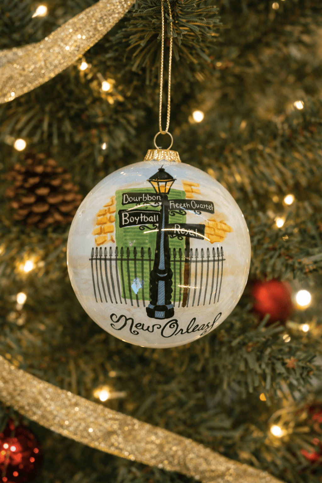 This hand-painted New Orleans glass ornament features an iconic lamp post with Bourbon, Royal, and French Quarter street signs set against charming wrought iron details. “New Orleans” script along the base completes the timeless Crescent City design.