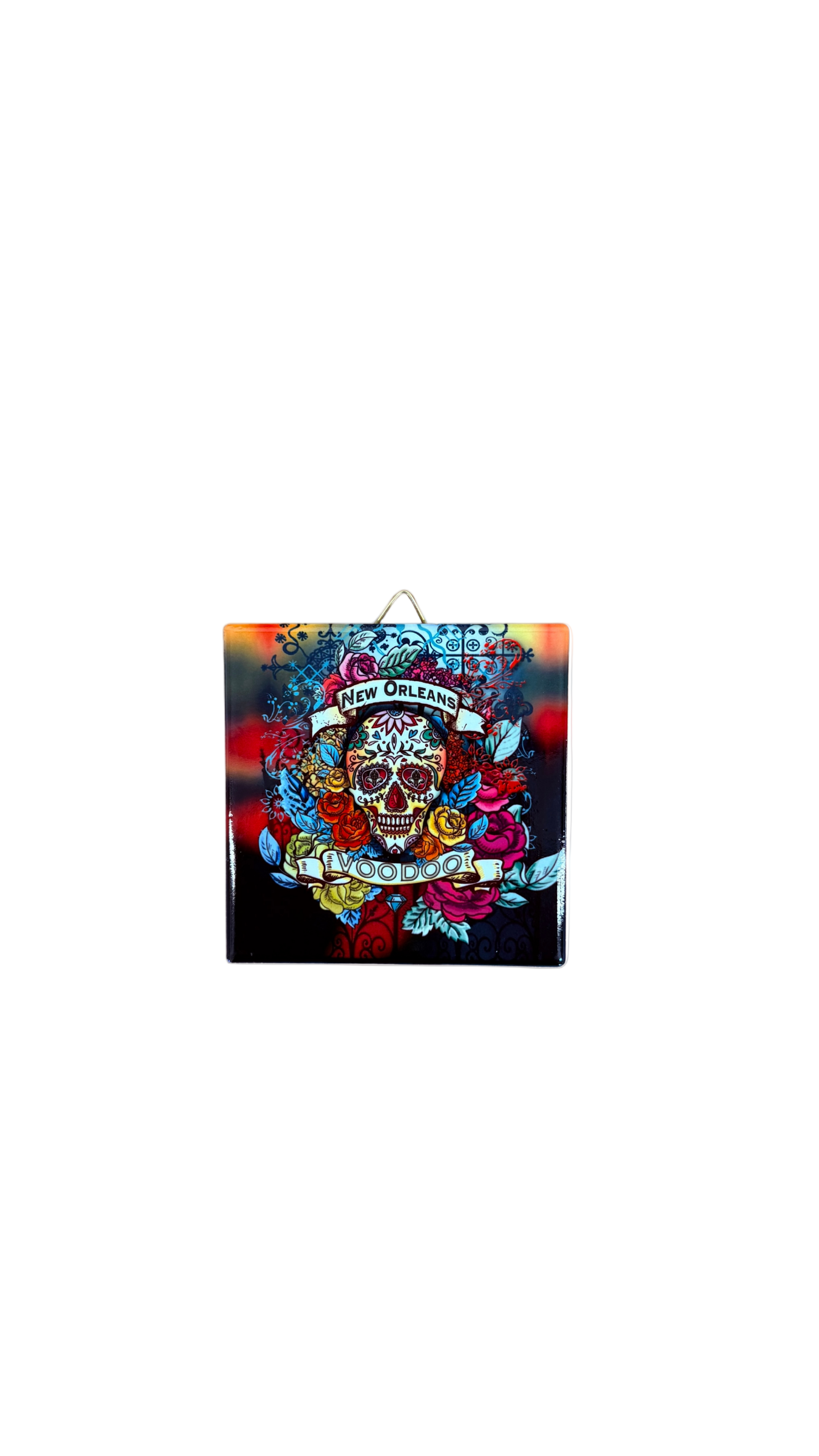 Embrace the mysterious side of the Crescent City with this 4" x 4" New Orleans Voodoo Skull decorative tile. Featuring a vibrant sugar skull surrounded by roses, feathers, and intricate patterns, this piece captures the city’s legendary mix of beauty, magic, and mystique. The rich colors and glossy finish make it a standout accent for your wall, shelf, or altar space. Includes padded backing and a metal hanger for easy display — a perfect gift or keepsake for lovers of New Orleans’ darker charm.