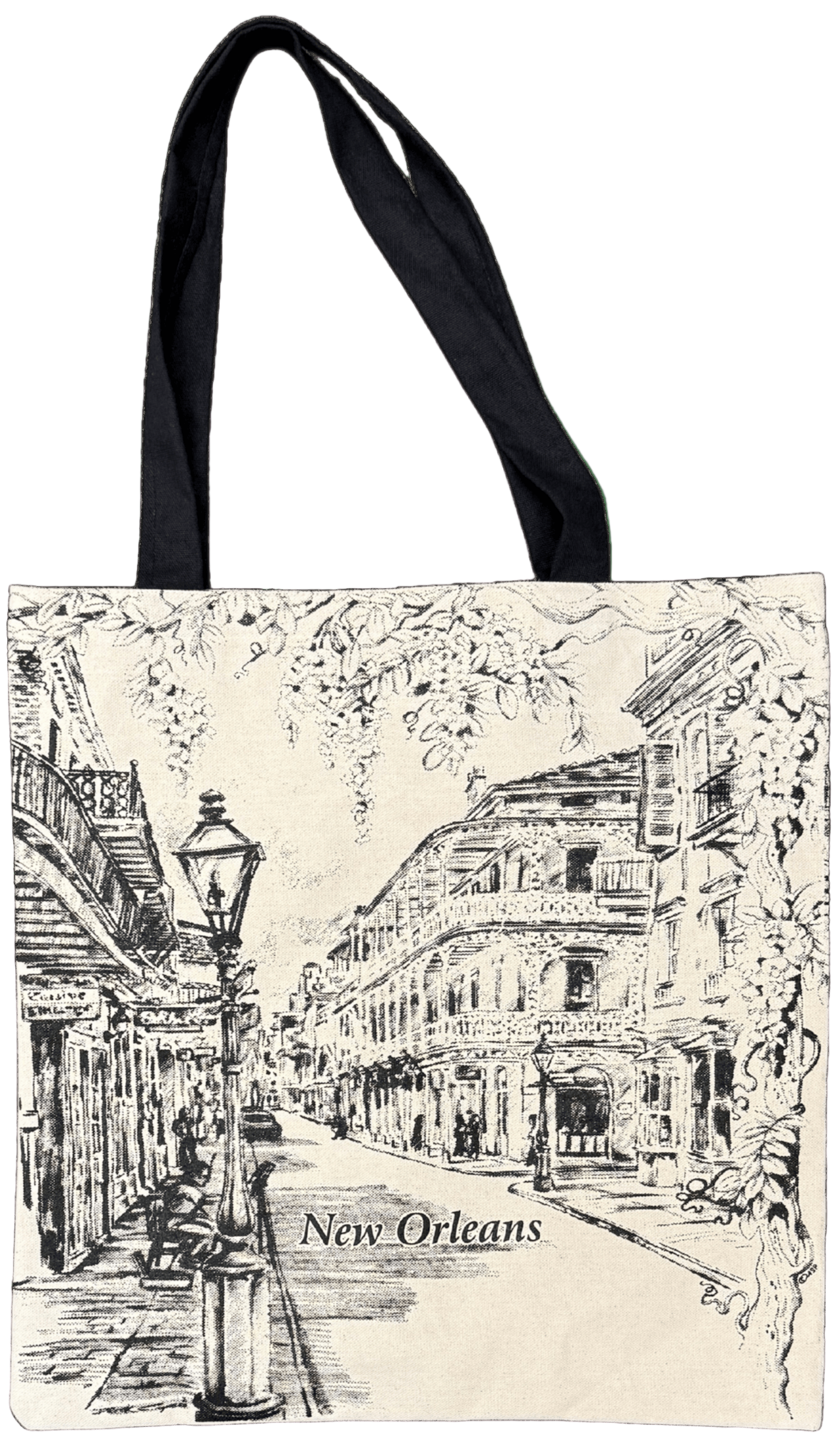 Carry the charm of the Crescent City with this elegant New Orleans French Quarter Street Scene Tote Bag. Featuring a beautifully sketched black-and-white illustration of a classic French Quarter street — complete with wrought-iron balconies, gas lamps, and tree-lined architecture — this tote captures the timeless romance of New Orleans.